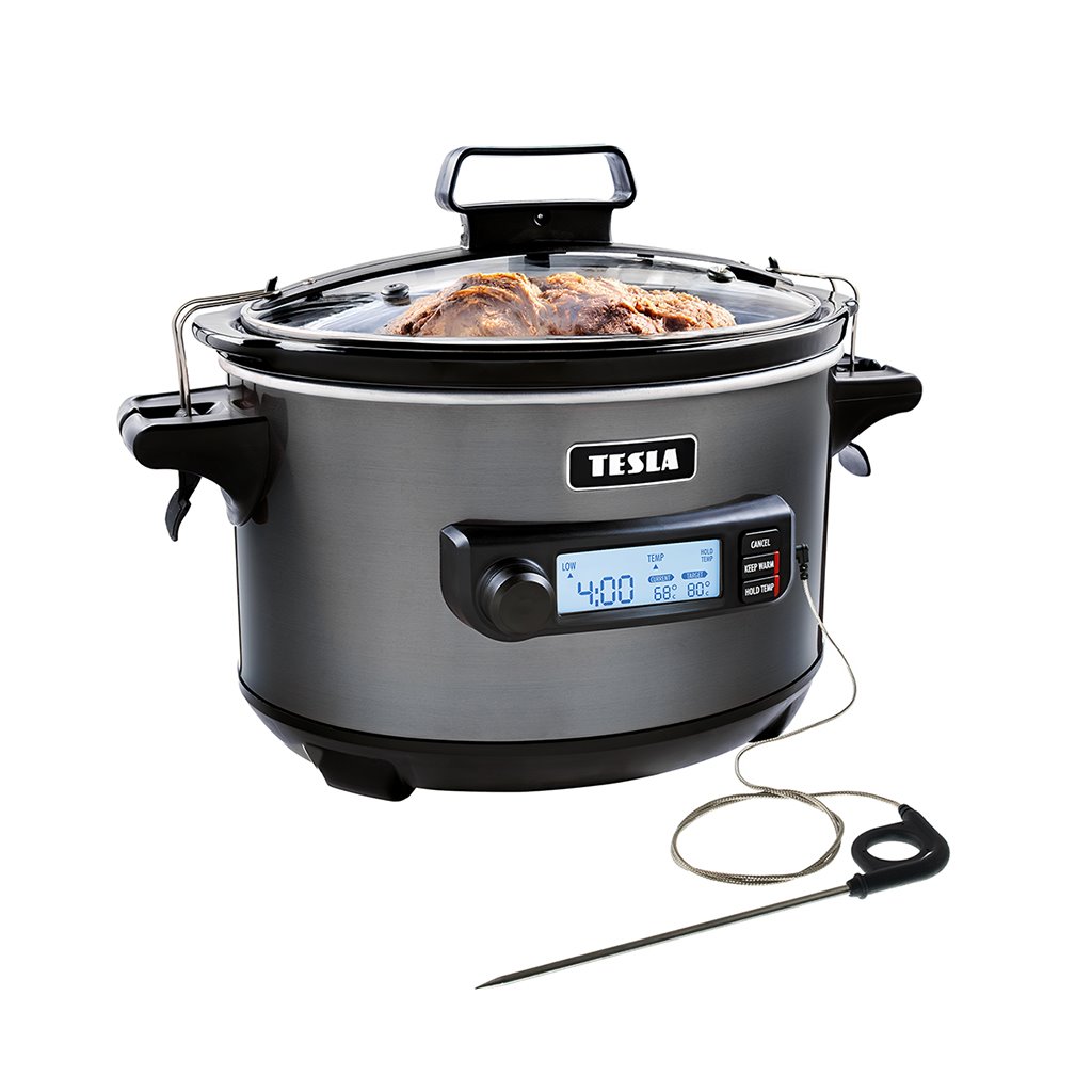 Pomalý hrnec TESLA je výborný pomocník pro všechny, kteří si chtějí připravit plnohodnotné a chutné jídlo, aniž by u vaření trávili dlouhé hodiny. Stačí do něj vložit všechny ingredience, nastavit teplotu s délkou vaření a to je vše. Připravte si šťavnaté a chuťově bohaté jídlo díky moderní technologii Sous vide. Potraviny se vakuově uzavřou a vaří v přesně řízené vodní lázni. Přesnou kontrolu aktuální teploty zajistí integrovaná teplotní sonda. Skleněná poklice je vybavena uzamykacím mechanismem.