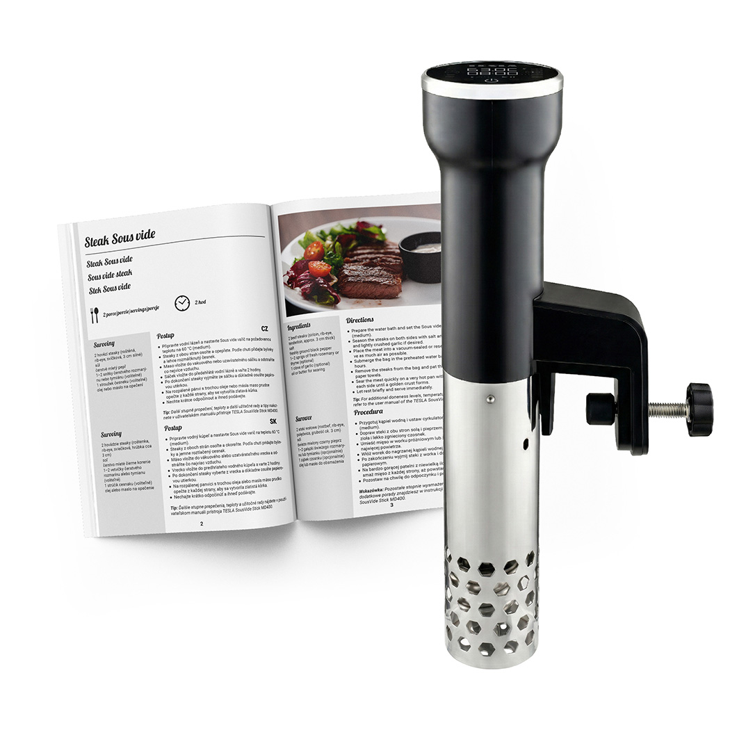 Zapomeňte na vysušené kuřecí prsa nebo nedopečené steaky. S ponorným vařičem sous vide TESLA SousVide Stick MD400 dosáhnete profesionálních výsledků v pohodlí domova. Neustále cirkuluje vodu a udržuje teplotu dle nastavené teploty, čímž zaručuje rovnoměrné uvaření. Vaření ve vakuu zachovává přirozenou chuť jídla, maso je křehké a šťavnaté, živiny, vitamíny a stopové prvky se neztrácejí. Tato technika uzamyká uvnitř potravin veškerou chuť, šťávu a vůni, což vede k bezkonkurenční textuře, které klasickým pečením či smažením nedosáhnete.
